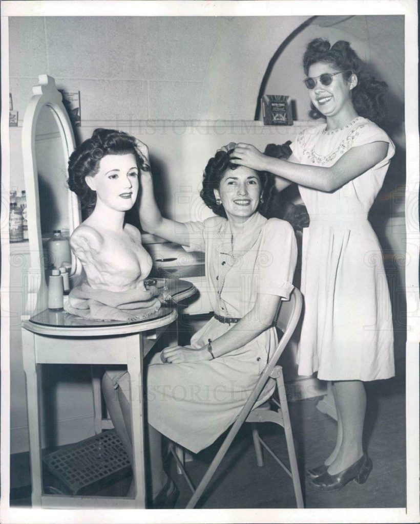 Also in my research, I found a photograph of two students in a beauty class in Hollywood in 1946. One is sitting in a chair, touching a mannequin head. The other is standing, working on the hair of the student sitting. The one standing has dark glasses and long, dark hair, and she is smiling. Her name is Vera Gurrola. The caption tells that the other student is Miss Helen Lopez, and both students have been blind for two and a half years.